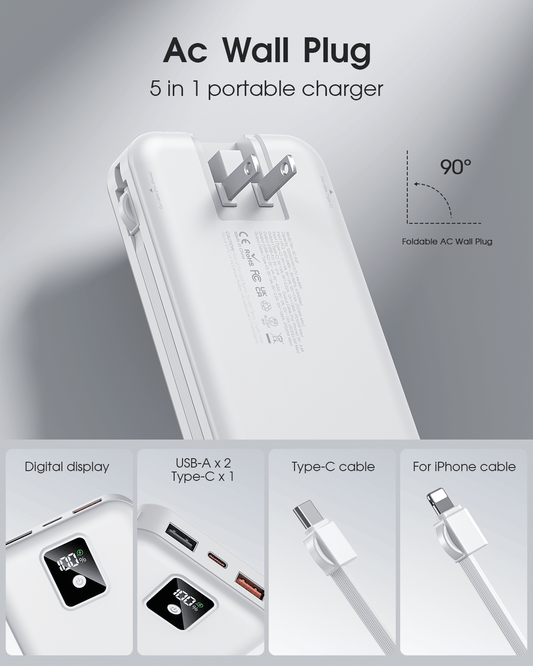 15000mAh Portable Power Bank with Built‑In Cables & Foldable Wall Plug – 22.5W Fast Charging Battery Pack